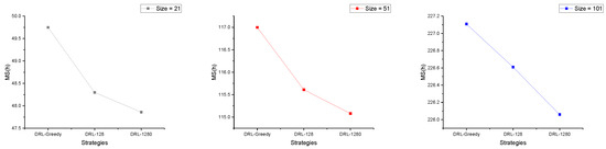 In Table 1, we record the performance of the DRL methods and all baselines for all problem sizes. The evaluation is based on the completion rate, the makespan, and the computation time. Through the analysis of Figure 7 and Figure 8, it can be concluded that the quality of the solution can be effectively improved by increasing the sampling times. So the strategy we used in the baseline comparison is DRL-1280. For AM, we also sample 1280 times and then get the optimal solution, which is called AM-1280. In all baselines, AM-1280 achieves the makespan with optimal performance on the test with problem size 21, but AM-1280’s performance decreases very quickly as the problem size increases. This is because the AM-1280 cannot effectively fuse the two heterogeneous features when the problem size increases, resulting in a sharp performance degradation. GA performs well on problems with a problem size of 21, but as the problem size grows, the performance starts to degrade drastically. This is because, with the increase in the problem size, the search space of the solution also increases greatly, resulting in a decline in performance. SA outperforms GA, but again, a dramatic drop in performance is found. Performance degrades for the same reasons as GA, but SA is more efficient for searching solution spaces. TS is optimal in all baselines on the rest of the tests due to its large search space and very adequate search of the space, which also leads to a long computation time. Compared to AM-1280, our method has a slightly worse length metric on the problem size of 21 but still has a very competitive performance. As the problem size grows, AM-1280’s performance decreases drastically, while our method can be well adapted to larger problems.