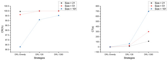 As shown in Figure 7, we record the effects on makespan under different strategies. In Figure 7, the sampling strategy’s performance is better than the greedy strategy’s performance, and the more sampling times, the better its performance. Similarly, in Figure 8, the completion rate increases with the number of sampling times. However, the computation time also increases with the number of sampling times, especially when the problem size increases. This is because there will be some errors when using neural networks to fit data, which is difficult to avoid. Therefore, the optimal solution obtained by using the Greedy strategy is not necessarily the optimal solution. The policy network generates a policy distribution at each time step, and the more times of sampling strategies, the more candidate solutions can be obtained, so that the optimal solution can be selected. The increasing number of sample times also leads to an increase in computation time. Therefore, the solution of DRL-1280 is the best among all strategies, but it also consumes the most computation time. The greedy strategy is noteworthy for its ability to quickly obtain high-quality solutions, making it particularly suitable for scenarios with strict time constraints, such as agricultural machinery scheduling.