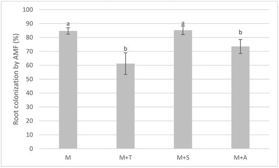 The plants inoculated with arbuscular mycorrhizal fungi showed an appropriate level of colonization (Figure 1); applying T. asperellum strain T34 (M + T) or A. pullulans strain DSM 14950 (M + A) slightly decreased the colonization level; however, the application of S. griseoviridis strain K61 (M + S) did not influence mycorrhizal presence. The highest colonization level was reached by using AMF individually (M) and AMF combined with S. griseoviridis strain K61 and was 84.68% and 85.16%, respectively.