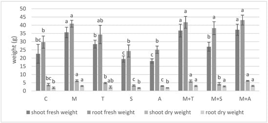 According to our results, the treatments in which we applied AMF increased the plants’ fresh and dry weight (Figure 2). When we applied only T. asperellum strain T34 (T), S. griseoviridis strain K61 (S), or A. pullulans strain DSM 14950 (A), the treatment did not have a significant impact on the weights compared to the control plants (C). In the case of the combined treatments, the beneficial effect of the AMF prevailed; when it was applied with T. asperellum strain T34 (M + T) or A. pullulans strain DSM 14950 (M + A), the measured shoot and root weights were the same as when we applied AMF individually (M); therefore, we did not observe the antagonist effect of the other fungi. When we applied AMF and S. griseoviridis strain K61 (M + S) in combined treatment, we recorded lower weight data compared to the plants that were inoculated only with AMF.