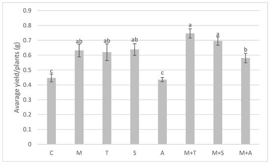 The average yield of the okra fruits/plants. C: no treatment; M: F. mosseae; T: T. asperellum strain T34; S: S. griseoviridis strain K61; A: A. pullulans strain DSM 14950; M + T: F. mosseae and T. asperellum strain T34; M + S: F. mosseae and S. griseoviridis strain K61; M + A: F. mosseae and A. pullulans strain DSM 14950. Mean values followed by the same alphabets did not differ significantly based on Tukey’s test (p < 0.05).