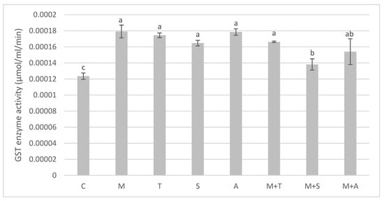 We observed elevated levels of GST enzyme activity when we applied beneficial microorganisms (Figure 4). Combined treatments also increased GST enzyme activity, although when we applied AMF and S. griseoviridis strain K61 together, they did increase the GST enzyme activity compared to the control plants (C) but not as much as other treatments. Further studies are needed to broaden the knowledge about the interaction between the applied microorganisms and their effect on the GST enzyme activity.