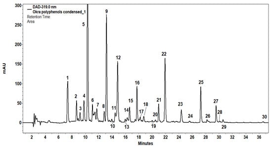 HPLC profile of phenolic compounds extracted from lyophilized okra fruits and separated on C18-PCP column with gradient elution of acetonitrile in 1% orthophosphoric acid. Detection was at 319 nm. Peak identification is shown in Table A6 in the Appendix A.