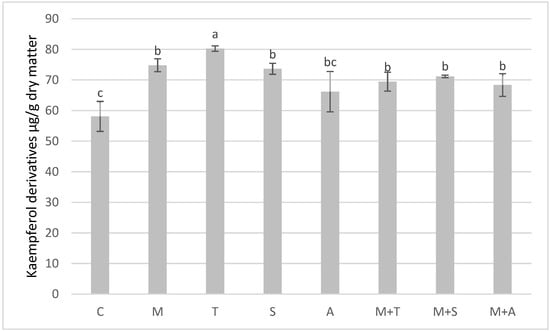 Effect of AMF and antagonistic microorganisms on kaempferol derivatives in okra fruit. C: no treatment; M: F. mosseae; T: T. asperellum strain T34; S: S. griseoviridis strain K61; A: A. pullulans strain DSM 14950; M + T: F. mosseae and T. asperellum strain T34; M + S: F. mosseae and S. griseoviridis strain K61; M + A: F. mosseae and A. pullulans strain DSM 14950. Mean values followed by the same alphabets did not differ significantly based on Tukey’s test (p < 0.05).