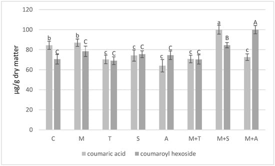 The results presented in Figure 7 demonstrate the response of coumaric acid derivatives to various treatments. Such important polyphenolic compounds exist in okra fruits in a free form and as coumaroyl-hexoside. The treatments of M + S and M + A showed an increase in the content of the two derivatives as compared to the control group. It is evident that a highly significant increase of coumaric acid and coumaroyl hexoside was recorded for treatments of M + A and M + S, respectively. As compared to the control, other treatments either decreased or had no significant effect on the level of coumaric acid derivatives. The results showed that the plants’ inoculation with microbes increased the level of coumaroyl derivatives by 43%, 22%, 12%, 9%, and 7% with M + A, M + S, M, S, and A, respectively. As for T. asperellum strain T34, no significant effect on coumaric acid in the okra plant was noticed.