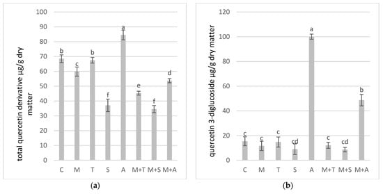 Impact of different biotic treatments on the content of total quercetin derivatives (a) and quercetin 3-diglucoside (b) in okra fruits. C: no treatment; M: F. mosseae; T: T. asperellum strain T34; S: S. griseoviridis strain K61; A: A. pullulans strain DSM 14950; M + T: F. mosseae and T. asperellum strain T34; M + S: F. mosseae and S. griseoviridis strain K61; M + A: F. mosseae and A. pullulans strain DSM 14950. Mean values followed by the same alphabets did not differ significantly based on Tukey’s test (p < 0.05).