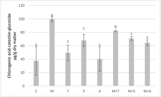 Distinct patterns were found in the accumulation of chlorogenic acid–catechin–glucoside phenols in okra fruit under the influence of arbuscular mycorrhizal fungi and antagonistic microorganisms M, T, A, and S and the combination of AMF with other microorganisms: M + T, M + A, and M + S. Quantitative measurements allowed for the characterization of phenolic content, with specific attention to variations induced by the microbial treatments. The biotic treatments with M, M + T, M + S, Sg, M + A, T, and A increased the level of these polyphenols by 163%, 116%, 86%, 79%, 63%, 29%, and 5%, respectively, and it was found that M and M + T treatments significantly increased the content of chlorogenic acid–catechin dimers in okra fruits as compared to the control (Figure 9).