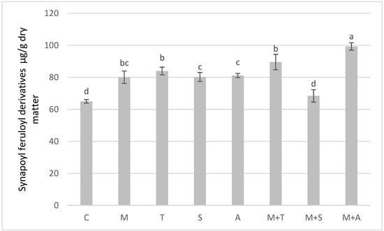 It is evident from the results presented in Figure 10 that all treatments of mycorrhiza alone or combined with other microbial strains, except for the combination of AMF with S. griseoviridis strain K61 (M + S), promoted the biosynthetic pathways of sinapic acid derivatives as compared to the control treatment. The highest increase in the content of such dimers was found in fruits of okra treated with AMF combined with A. pullulans strain DSM 14950.