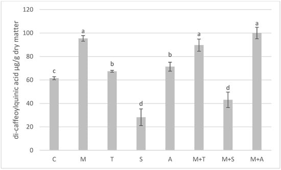 In Figure 11, the synergistic impact of the combined application of mycorrhiza and other microorganisms on di-caffeoylquinic acid levels in okra fruits is depicted. All treatments except S and M + S treatments showed significantly higher contents of di-caffeoylquinic acid in okra fruits. The highest increase in the concentration of this polyphenol was found in M, M + T, and M + A with no significant variation between them in their impact on di-caffeoylquinic acid. In particular, the S-type bacterial inoculation had a remarkable negative impact on the metabolic pathway of this polyphenol, most probably due to the partial inhibition of the enzymes involved in the biosynthesis processes of di-caffeoylquinic acid. The combination of S with AMF slightly moderated the negative effect of S on di-caffeoylquinic acid formation in okra fruit; however, the difference was not significant.