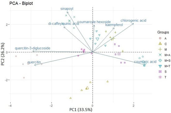 Principal component analysis of individual polyphenols was performed, and its result is shown in Figure 12. The first two principal components (PC1 and PC2) explain 59.7% of the total variation. Three components showed eigenvalues higher than 1 (Table A4 in the Appendix A). PC1, covering 33.5% of the total variation, had negative associations with quercetin and quercetin-3-diglucoside and positive associations with coumaric acid and chlorogenic acid. In addition, 26.2% of the total variance was covered by PC2, which was positively influenced by kaempferol, coumaroyl hexoside, chlorogenic acid, sinapoyl, and di-caffeylquinic acid (Table A5 in the Appendix A).