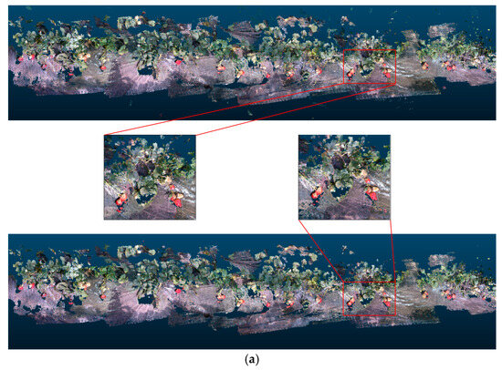 The reconstruction results of several strawberry plants: (a) represents the point cloud map of the reconstruction results; (b) represents the semantic point cloud map of the reconstruction results.