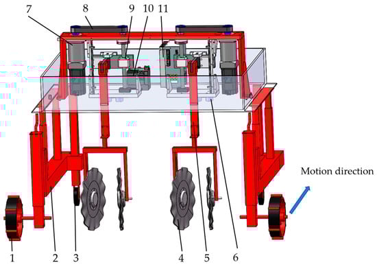 The overall structure. Note: 1. profile wheel; 2. machine frame; 3. guide wheel; 4. stubble breaker; 5. lifting connecting rod; 6. ultrasonic sensor; 7. servo motor; 8. synchronous belt; 9. screw slide table module; 10. PLC; 11. servo driver.