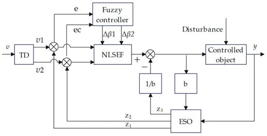 Han Jingqing [] proposed an ADRC that includes a tracking differentiator (TD) [], a nonlinear-state error feedback (NLSEF) [], and an extended-state observer (ESO) []. The core of ADRC technology is to estimate and compensate the total disturbance of the system by reducing the unmodeled dynamic disturbance and the out-of-position disturbance of the system.