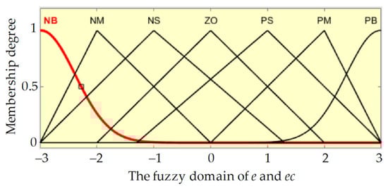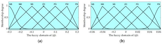 According to the control process of the fuzzy controller, seven fuzzy linguistic variables are defined as follows: PB (positive large), PM (positive medium), PS (positive small), ZO (zero value), NS (negative small), NM (negative medium), and NB (negative large) []. Additionally, based on the experience of parameter regulation of NLSEF in ADRC [], the theoretical domain of input quantities e and ec is [−3, 3], the theoretical domain of output quantity Δβ1 is [−0.3, 0.3], and the theoretical domain of Δβ2 is [−0.06, 0.06].