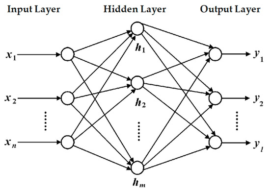 In 1985, Rumelhart et al. proposed the BP neural network, which is a multilayer feedforward network utilizing an error backpropagation algorithm. It possesses excellent nonlinear generalization and information processing capabilities. The learning process of the BP neural network primarily involves forward transmission and backpropagation. The standard BP model consists of an input layer, a hidden layer, and an output layer []. The network topology is illustrated in Figure 6, with n input nodes, m hidden layer nodes, and one output node.