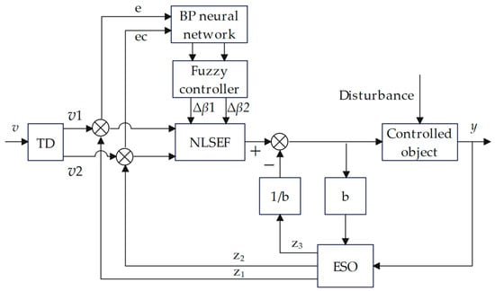 In this paper, the BPNN algorithm is employed to predict and adjust the β1 and β2 parameters of the fuzzy ADRC. The adjusted parameters Δβ1 and Δβ2 are then input into the NLSEF of the ADRC, enabling parameter sub-regulation of the nonlinear feedback control. The structure diagram of the fuzzy ADRC control based on BPNN is illustrated in Figure 7.