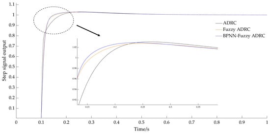 From the response curve in Figure 8, we know that the rise time of the fuzzy ADRC and BPNN controller is 0.039 s, both 0.017 s faster than ADRC. The overshoot of the BPNN fuzzy ADRC controller is 0.1%, which is less than 1% of fuzzy ADRC and 2% of ADRC; The adjustment time of the BPNN fuzzy ADRC is 0.089 s, which is smaller than the 0.100 s of the fuzzy ADRC and the 0.303 s of the ADRC. Compared with the fuzzy ADRC and ADRC, the BPNN fuzzy ADRC control system responds more quickly, has a smaller overshoot, and has the shortest time to reach the system steady state. Its significance lies in that when the system detects obstacles, the servo motor can sound quickly, and reach the target value stable state in 0.089 s, the response process is stable, the maximum overshoot is only 0.1%, and there is no steady-state error. The fuzzy ADRC optimized by BPNN has a very significant control effect.