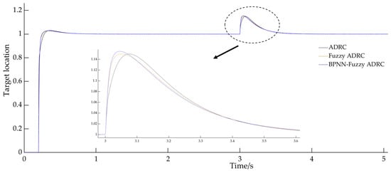 It can be seen from Figure 9 that when the servo motor control system receives interference from external signals, the motor response will suddenly change under the three control algorithms. The time for the BPNN fuzzy ADRC to return to the steady state is 0.22 s, which is less than the 0.45 s of the fuzzy ADRC and the 0.56 s of the ADRC. Compared with the fuzzy ADRC and ADRC controller, the fuzzy ADRC optimized using the BPNN algorithm can return to the target value the fastest when subjected to load fluctuations, indicating that the servo motor system is least affected by external interference and improves the stability of the obstacle avoidance control system. Therefore, the use of the BPNN fuzzy ADRC can effectively complete the tracking control of the servo motor to the target signal in the case of load fluctuations.