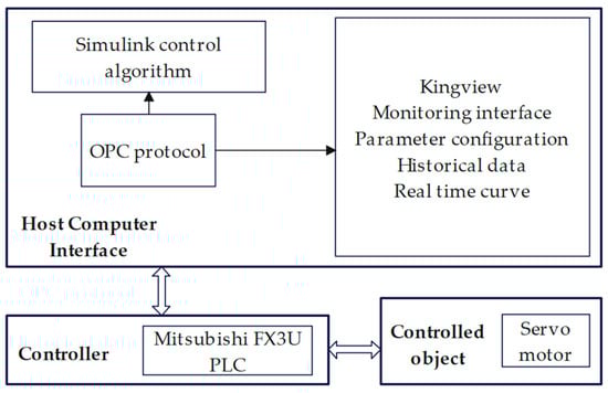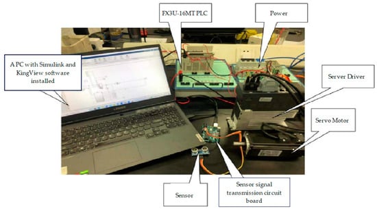 OPC communication technology [] is employed for communication between Simulink and Kingview software, while the R232 serial port facilitates communication between Kingview and the PLC. The configured Simulink model, PLC, Kingview software, sensors, servo drives, servo motors, and power supply are interconnected to establish the hardware-in-the-loop simulation test platform, as illustrated in Figure 11.