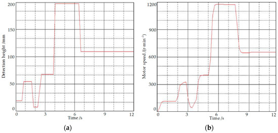 The target height information collected by the ultrasonic sensor, that is, the height of the obstacle, is input into the mathematical model of obstacle avoidance control built in Matlab through the A/D conversion module, and the control instructions are sent to the servo driver by PLC to drive the servo motor. The variation curve of motor speed ω with the target height h is observed. The value of h represents the measured value from the sensor. Figure 12a shows the real-time changing image of the input signal h, while Figure 12b displays the real-time variation curve of the monitored speed ω in Kingview.