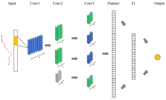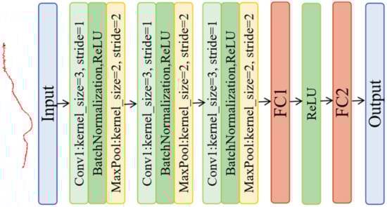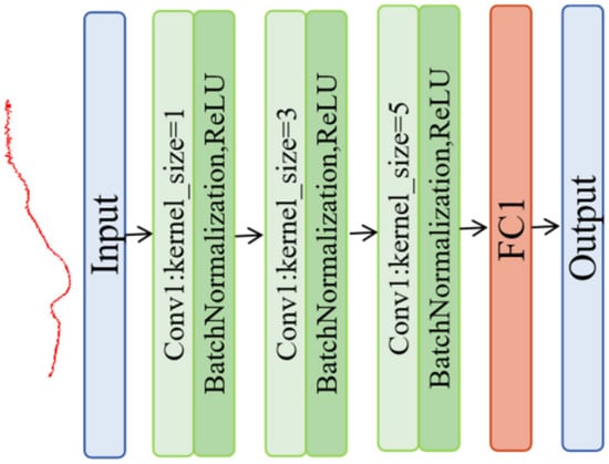 This study introduced a classic CNN for data processing (Figure 4), which was comprised of three layers. In the first layer, Conv1, one-dimensional convolution was implemented using 16 channels, each with a kernel size of 1, which was enhanced with batch normalization and ReLU activation. This layer was designed to capture distinctive features in the input data. In the second layer, the channels count was increased to 32 with a kernel size of 3, thereby advancing the feature refinement process. In this layer, batch normalization and ReLU activation were also integrated. In the third and final convolutional layer, the feature extraction capability with 64 channels and a kernel size of 5 was escalated and continued with batch normalization and ReLU. The network culminated with a fully connected layer, where the high-dimensional features extracted by the preceding layers were mapped to a single output tailored for tasks such as classification and detection. The classic CNN has shown a dropout value of 1.
