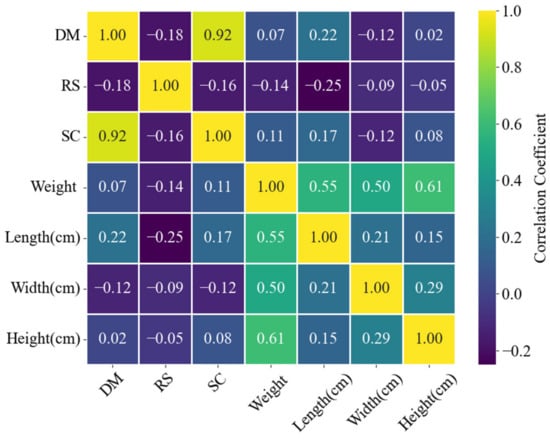 Table 1 displays statistical results of the compositional and physical characteristics in potatoes, indicating that the reference DM values were in the range of 13.10–20.38 g/100 g, the reference SC was in the range of 9.20–17.91 g/100 g, and RS was in the range of 0.090–1.17 g/100 g, respectively. The dimensions of the samples varied, with widths ranging from 51.5 to 80.0 mm, heights from 42.0 to 68.0 mm, and lengths from 47.0 to 105.0 mm. Their weight ranged between 159.14 and 326.95 g.