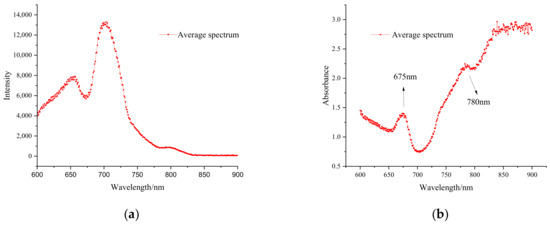 The transmission spectrum (Figure 6a) of the potato was transformed into an absorbance spectrum, and the transformed spectral curve is shown in Figure 6b. Prominent transmission band peaks were observed between 600 and 850 nm, specifically, major transmission peaks were observed around 625–675, 675–725, and 780–810 nm. Major absorbance peaks found around 675 nm were the chlorophyll absorption peak [7,33], and the absorbance of the 675–700 nm spectrum gradually decreased with the weakening effect of chlorophyll on the spectra, demonstrating a small range of variation in the 700–900 nm range. Another absorbance peak normally attributed to the OH functional groups was found near 780 nm [34].