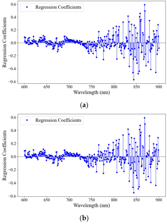 Regression coefficients of the PLS model developed for the DM content prediction using wavelength ranges of 600–900 nm in the potatoes ((a): DM for the raw spectral data; (b): DM for the augmented spectral data).