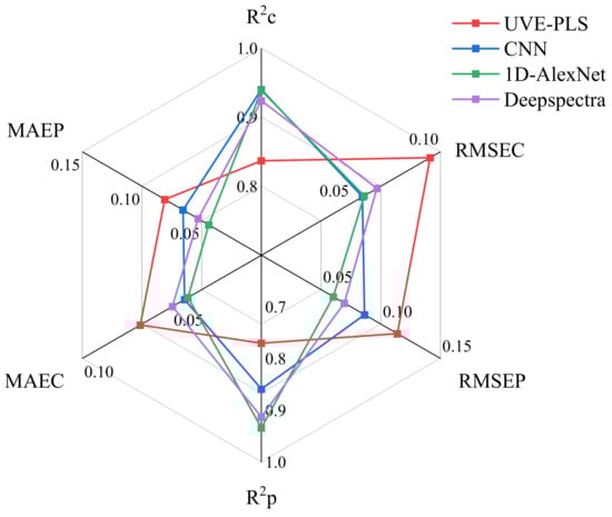 The deep-learning model was randomly run five times to test its robustness, with the training samples and test samples remaining unchanged. To enhance comprehension and facilitate a clear comparison of the overall parameters, a spider diagram was generated to illustrate the average performance from five runs of the employed UVE-PLS and 1D-CNN models (Figure 8). In the DM prediction, the analytical results suggested that the 1D-AlexNet model exhibited superior calibration with the better R2c (0.940), which denoted a robust model fit to the calibration data. This was complemented by its minimal RMSEC (0.0574 g/100 g) and MAEC (0.0410 g/100 g) values, indicating high precision in the calibration set. Meanwhile, 1D-AlexNet showed a good performance in the prediction set, with an R2P value of 0.934 and an RMSEP value of 0.0603 g/100 g, denoting its efficacious generalization capability. Additionally, DeepSpectra demonstrated substantial predictive accuracy with an R2P value of 0.913 and an RMSEP value of 0.0695 g/100. The consistency of the observed trends across various metrics for the calibration set and prediction set reinforced the robustness of the models, suggesting their versatility in the calibration and prediction sets of the potato online testing capabilities. The classic CNN model achieved an R2P value of 0.859, which underscored its potential predictive validity. However, UVE-PLS, while exhibiting reasonable calibration and prediction results, was surpassed by the CNN models in most metrics. Compared to UVE-PLS, the R2P value improved by 21.31% (0.770 to 0.934) and the RMSEP value was reduced by 47.31% (0.114 to 0.0603) of 1D-AlexNet. The R2P value improved by 18.64% (0.770 to 0.913) and the RMSEP value was reduced by 39.30% (0.114 to 0.0695) compared to DeepSpectra. The R2P value improved by 11.62% (0.770 to 0.859) and the RMSEP value was reduced by 18.81% (0.114 to 0.0865) compared to the classic CNN model.