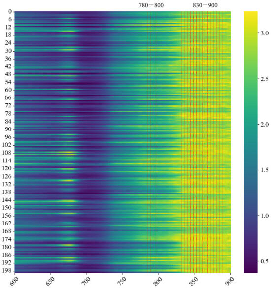 Understanding the reason behind a model’s prediction may be just as crucial as its accuracy in practical applications [36]. The essential bands for 1D-AlexNet to predict DM are marked by GRAD-CAM analysis in Figure 9. The more effective wavelengths were between 730 and 900 nm, which were recommended for good DM prediction [8,37]. In a previous study, the optimal wavelength range within short-wave NIR spectroscopy for DM assessment was expected to encompass the water-related peaks at around 840 and 870 nm [38]. In this study, in particular, 780–800 and 830–900 nm are more helpful for predicting DM content. This indicated the crucial role of these wavelengths in predicting the DM within the samples, which was possibly due to the following reasons: (1) The wavelengths with high weight values were mostly in the near-infrared range, avoiding the influence of surface color variations and internal pigment absorption on the model. (2) Wavelengths near 780 nm were attributed to the OH functional groups; wavelengths near 840 nm provided absorption information for the combined bands of C–H3, C–H2, and C–H; and wavelengths near 870 nm were possibly relative to the third overtone of C–H [13], exhibiting a strong correlation with DM.