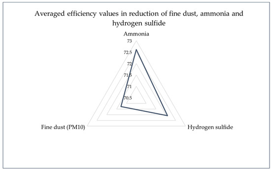 3.4. Evaluation of the Efficiency of Ammonia, Hydrogen Sulfide, and Fine Dust Removal