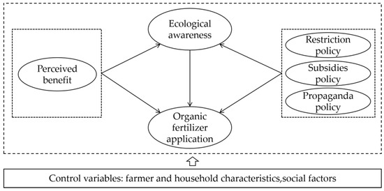 Therefore, this study believes that perceived benefit, restriction policy, subsidies policy, and propaganda policy all directly affect farmers’ organic fertilizer application. Additionally, these also affect their behaviors through ecological awareness. Based on this, our study establishes an analytical framework (Figure 1) and verifies the above argument through empirical analysis.