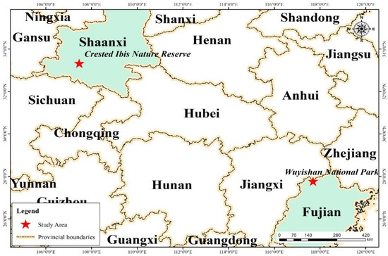The study areas included Wuyishan National Park (WNP) and the Crested Ibis Nature Reserve (CINR), as shown in Figure 2. WNP was established as a pilot national park in 2016 and officially established in 2021. WNP preserves the primary forest ecosystem. The forest ecosystem is the most intact, typical, and largest area in the middle subtropical zone and is located along the same latitude. It is a key area for global biodiversity conservation. The livelihoods of 80% of the community are based on tea, which is the main source of income for the local people. The contradiction between conservation and development is prominent here. To address this effectively, ecological tea gardens were developed, mainly by adopting organic fertilizers, which in turn improved the quality of the tea and enhanced market recognition. This increased ecological protection for the national park and provided significant perceived benefits for farmers.