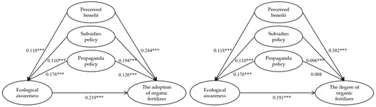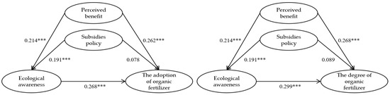 Overall, perceived benefit, subsidies policy, and propaganda policy directly promoted farmers’ organic fertilizer application. In addition, these indirectly influenced organic fertilizer application through ecological awareness.