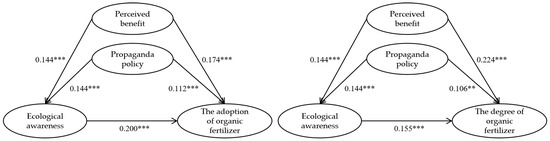 The results are listed in Table 7. Figure 3 shows the intermediary path. As can be seen from the results, perceived benefit, subsidies policy, and propaganda policy significantly and positively influenced farmers’ ecological awareness. Therefore, perceived benefit can enhance farmers’ ecological awareness. Government subsidies and propagation can also enhance farmers’ ecological awareness. In Model 7, perceived benefit, subsidies policy, and propaganda policy significantly and positively influenced the adoption of organic fertilizer. Additionally, ecological awareness also positively influenced behavior at a 1% level. Model 8 indicates that perceived benefit and subsidies policy significantly and positively influenced the degree of organic fertilizer. Ecological awareness also positively influenced the degree of organic fertilizer at the 1% level. These results suggest that ecological awareness has a mediating effect.