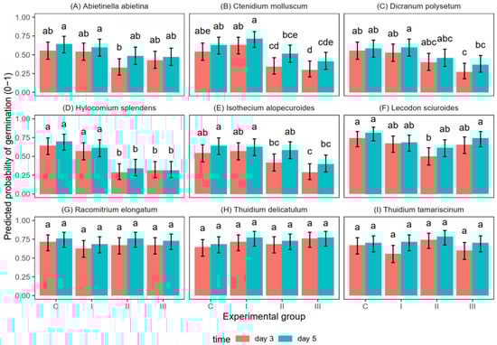 The predicted probability of the germination of the lettuce seeds. C—control groups; I–III—applications of 10−4, 10−3, 2 × 10−3 mg/mL concentrations of the selected moss species extract (respectively). The bars represent the predicted probability of germination (0–1) with the error bars denoting the 95% confidence intervals (CI). Statistically significant differences (p < 0.05) among the experimental groups are indicated by the letters above the bars.