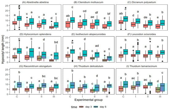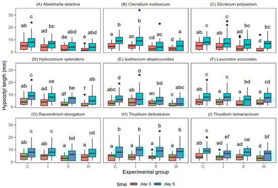 The effects of the ethanolic moss extracts on the lettuce seedling hypocotyl length. C—control groups; I–III—applications of 10−4, 10−3, 2 × 10−3 mg/mL concentrations of the selected moss species extract (respectively). Black horizontal lines represent the median, while the box ranges from the first (Q1) to the third (Q3) quartile, with the whiskers extending to the 1.5 × IQR (interquartile range) from the edge of the boxes. The black dots represent observations outside the 1.5 × IQR (interquartile range). Statistically significant differences (p < 0.05) among the experimental groups are identified by the letters above the boxplots.