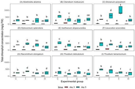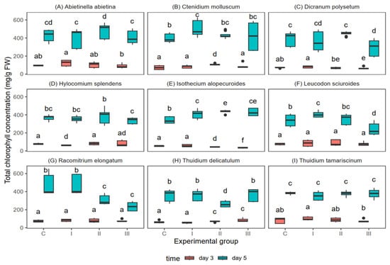 The total chlorophyll concentration of the lettuce seedlings. C—control groups; I–III—applications of 10−4, 10−3, 2 × 10−3 mg/mL concentrations of the selected moss species extract (respectively). Black horizontal lines represent the median, while the box ranges from the first (Q1) to the third (Q3) quartile, with the whiskers extending to the 1.5 × IQR (interquartile range) from the edge of the boxes. The black dots represent observations outside the 1.5 × IQR (interquartile range). Statistically significant differences (p < 0.05) among the experimental groups are indicated by the letters above the boxplots.