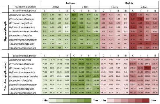 In this study, we found that the interaction is species-specific and depends on the tested counterparts (Figure 7). Despite being unable to infer very much from the hypocotyl length and total chlorophyll content after 3 day-long treatments with various concentrations of different moss extracts, it is noticeable that hypocotyl elongation was slightly suppressed in both lettuce and radish. Although there are certain dissimilarities between all the tested moss extracts concerning the lettuce and radish hypocotyl growth, the extracts of L. sciuroides and R. elongatum did not affect the elongation of the hypocotyl length either in lettuce or in radish. On the other hand, the extracts of A. abietina inhibited the elongation of the hypocotyl in both lettuce and radish, indicating a strong allelopathic effect. The other tested extracts manifested variable effects depending on concentration, the duration of the experiment, and the species tested. Therefore, the allelopathic effects can be described as species-to-species specific for most of the tested taxa.