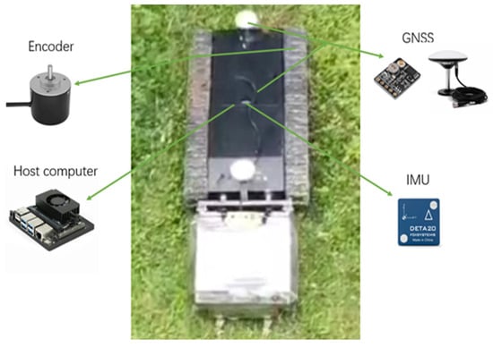 The IMU, GNSS, and odometry are mainly used to build the positioning system. The IMU module is DETA20, which is mounted and fixed at the center of the mower body, and its main parameters are shown in Table 1. The GNSS module is ATGM336H-5N, and the GNSS dual antennae are mounted at the front and rear of the mower chassis and are symmetrical about the center of the body; the main parameters are shown in Table 2. This mower odometry positioning method uses a 2500-line incremental encoder built into the chassis motor, and the host computer communicates with the motor driver through the USB serial port to indirectly obtain motor encoder information on both sides. The GNSS and IMU modules communicate directly with the main control board through the USB serial port, and all three use the system network time as the time stamp to synchronize and align the time data of each sensor.