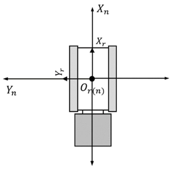 While turning, in addition to the error in straight driving, the outer high-speed track of the mower will slip backward due to being pulled by the inner low-speed track, while the inner low-speed track will slip forward due to being pulled by the outer high-speed track, which means that side-slip occurs, making the odometry model as shown in Figure 7.