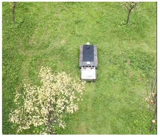 To verify the efficiency of the proposed method in the next section, the tractor mower experimental platform is used to test the positioning accuracy in a relatively open orchard environment. By controlling the movement of the mower in the environment, the positioning system calls each sensor data point in real time to obtain the positioning results. Given the numerous obstacles present in the orchard environment, we elected to conduct our experiments in a more open area, measuring approximately 8 m in length and 3 m in width. After advanced testing, it was determined that the differential GNSS signal in this area is of high quality, and the positioning accuracy can reach the centimeter level with high positioning accuracy. Therefore, the whole experiment uses the differential GNSS positioning result as the reference value, and the experimental site is shown in Figure 4.