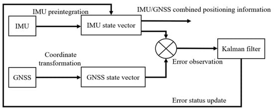 The above equation combined with the Kalman filter gain and data update equation can be established based on the error state of the Kalman filter model. This method allows the use of an IMU alone to maintain a certain level of accuracy when the GNSS signal is affected. The combination of positioning principles is shown in Figure 5.