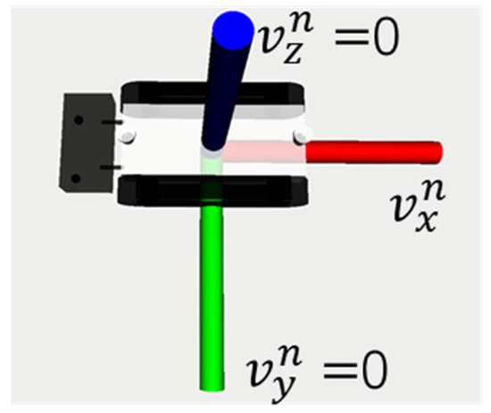 Since the controllable degrees of freedom of the mower are less than its total degrees of freedom, the NHC can be utilized to limit the data output from the IMU when its lateral sliding and motions perpendicular to the ground are not considered. This means that the data output from the IMU have zero velocity in the direction perpendicular to the movement of the mower and zero velocity in the direction perpendicular to the ground; the principle is shown in Figure 8 [26].
