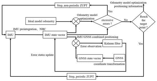 Therefore, combined with the navigation operation path of the mower in the area, the lawn mower will temporarily stop and run ZUPT when reaching the target point. This means that periodic ZUPT reduces the positioning deviation to within the threshold and improves the positioning accuracy. A schematic diagram of the ZUPT-based lawn mower positioning system is shown in Figure 10.