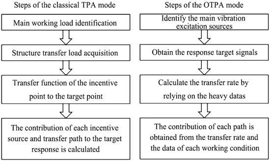 Operational Transfer Path Analysis is an accurate and effective method to diagnose the machine vibration and noise problem [25]. The product of the working load and the path frequency response function represents the path contribution in the TPA method, and the TPA method can further be divided into a single-reference TPA versus the multi-reference TPA method according to the number of incentive sources, which is shown in Figure 1.