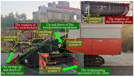 Since the complete machine is a nonlinear system, when the system motion parameters are subjected to a linear conversion, the space coordinate transformation also needs to be expressed by linearization when the transfer matrix of working devices is derived by regarding the harvester as a spatial combination. As shown in Figure 2, although the movement of each device is different, the movement of a working device is basically no more than three degrees of freedom. Therefore, the movement of each device on the harvester can be regarded as spatial movement under the device fixation.