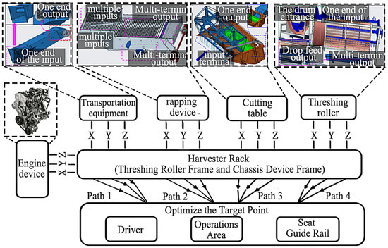 The vibration transmission path of each device also needs to be analyzed when analyzing the vibration transfer characteristics of the harvester. As a complex multi-body system, the combine harvester has numerous incentive sources, and the vibration transmission paths of various incentives are also extremely complex. The cutting table, transportation equipment, threshing roller and engine device are the main devices that produce the vibration in the x-y-z three-axis transfer direction. In addition, different devices can transfer vibrations to each other through a chassis device frame or threshing device frame.