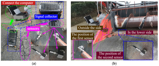 To obtain the vibration signals of each device and study the transmission characteristics, four sensors are installed on two adjacent working devices of the harvester in the vibration measurement experiments. Each sensor can measure the acceleration of the x-y-z three axes of each device. Therefore, the vibration acceleration signals for twelve channels can be obtained through the vibration experiment in total. The vibration conditions of two devices are measured each time under different working conditions. Therefore, the vibration signals of each working device can be obtained under multiple working conditions.