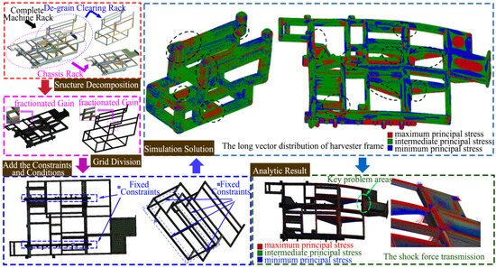 The frame of the rice combine harvester was split into the threshing roller frame and chassis frame. After adding materials, dividing grids and exciting force conditions, the harvester threshing cleaning frame and chassis frame can simulate the exciting force. The specific process is shown in Figure 7. Then, according to the simulation results of the frame excitation force transfer and vibration characteristic experiment, the main area of the frame damping and vibration reduction optimization of the rice harvester can be obtained.